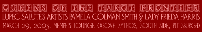 LUPEC members Brandy "You're a Fine Girl" Alexander and Black Monday dusted off both their Tarot Decks and their Junior High School Competitive Streak to offer free readings at Memphis Lounge above Zythos Bar on Pittsburgh's South Side. The pupose of the evening was to honor the artists who created the two most popular Tarot decks; Pamela Colman Smith and Lady Frieda Harris. Honoring these two artists is very necessary as neither has her name directly applied to the deck she created. Lady Harris created The Thoth Tarot, known most commonly by the man who commissioned it, Aleister Crowley. Smith created the Rider-Waite deck, which derives its name from its first publisher (Rider) and Smith's fellow Order of the Golden Dawn Member and "creative director" of the deck, A.E. Waite. LUPEC felt it was high time to draw attention to the women who actually created the compelling images of both best-selling decks.